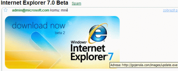 V této souvislosti je dobré znova upozornit na virus, který se šíří v podobě obrázku s odkazem na stažení Internet Explorer 7. Sice jsme se o tom již před nějakou dobou zmiňovali a čtenáře varovali, ale e-maily tohoto typu se začaly znova velice dobře šířit.