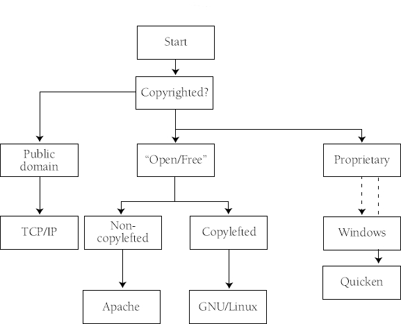 Říká se, že jeden obrázek vydá za tisíc slov. Ten následující je převzat z knihy Government Policy toward Open Source Software, a nastiňuje kategorizaci softwaru podle typu použité licence. U každé větve je také příklad.