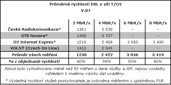 I když je dle aktuální velkoobchodní nabídky T/O2 k dispozici i služba o nominální rychlosti 3 Mbit/s, nebudou naměřené rychlosti u této služby prozatím uváděny, protože významnější DSL poskytovatelé tuto rychlost v síti T/O2 nenabízejí.