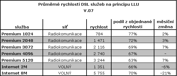 V úvodu bylo zmíněno, že zákazníci DSL služeb na principu LLU již nedosahují nejvyšších průměrných rychlostí, protože ve srovnání s DSL sítí T/O2 neexistuje významný rozdíl v portfoliu nabízených služeb z hlediska rychlostí. Následující tabulka však potvrzuje, že u DSL služeb na principu LLU ve srovnání s DSL v síti T/O2 se skutečně dosahované rychlosti více přibližují rychlostem objednaným.