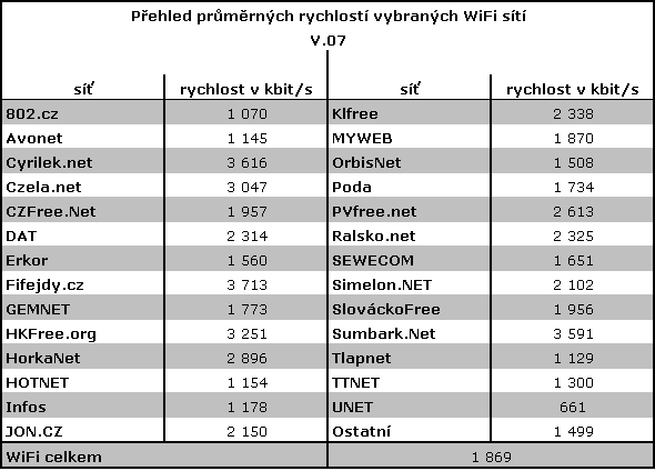 Tabulka rychlostí ve WiFi sítích potvrdila vzestupný trend rychlostí z minulého měsíce. Je třeba připomenout, že na měřáku DSL.cz identifikují uživatelé níže uvedená měření jako měření z WiFi sítí, ale v mnoha případech se může ve skutečnosti jednat o jinou technologii připojení k internetu.