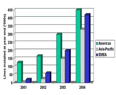 Podle právě zveřejněných statistik společnosti Point Topic , která se dlouhodobě věnuje sledování trhu DSL i dalších širokopásmových technologií ve světě, bylo celosvětově v polovině letošního roku instalováno asi 11,4 miliónů přípojek DSL do podniků (z toho 4,5 milióny v evropském regionu), což představuje nárůst o celou čtvrtinu oproti konci loňského roku.