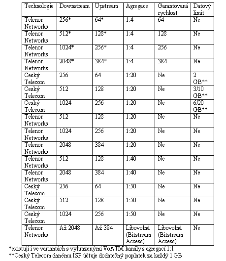 do 1024 kbps u Českého Telecomu a do 2048 kbps u Telenor Networks. V