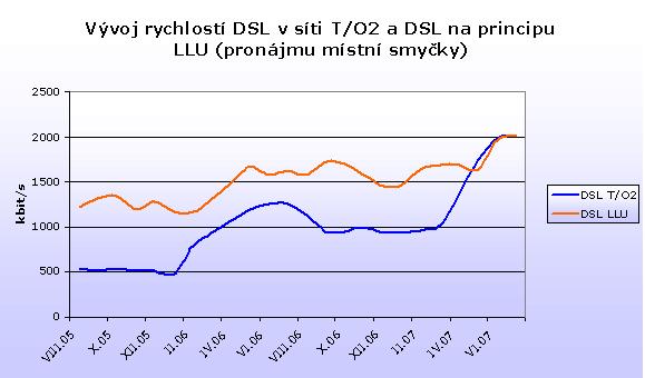 Zajímavé je porovnání vývoje průměrných rychlostí DSL v síti T/O2 a DSL na principu LLU za poslední 2 roky.