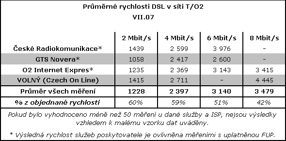 Rychlosti DSL v síti T/O2 (Telefóniky O2) zaznamenaly u sledovaných služeb v minulém měsíci zlepšení. Nejvíce se zlepšení projevilo u DSL přípojek s nominální rychlostí 2 Mbit/s, kdy průměrné rychlosti stouply z červnových 1 090 kbit/s na červencových 1 228 kbit/s. Důvodem je zvýšení FUP limitu u nejpoužívanějších služeb ze 3 na 10 GB měsíčně.