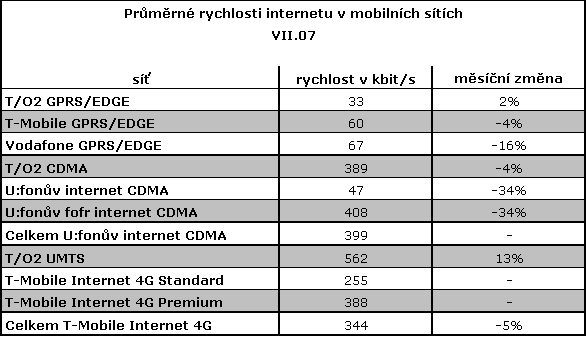 Jak bylo zmíněno v úvodu, za červenec je k dispozici poprvé významnější množství měření rychlostí ze sítě U:fon. Z výsledků měřáku DSL.cz vyplývá, že tato síť má velmi podobné vlastnosti jako CDMA od T/O2 (služba O2 Internet Mobil 1024 Plus). Obě služby mají průměrné rychlosti okolo úrovně 400 kbit/s s tím, že maximální rychlosti dosahují až k hranici 1,5 Mbit/s.