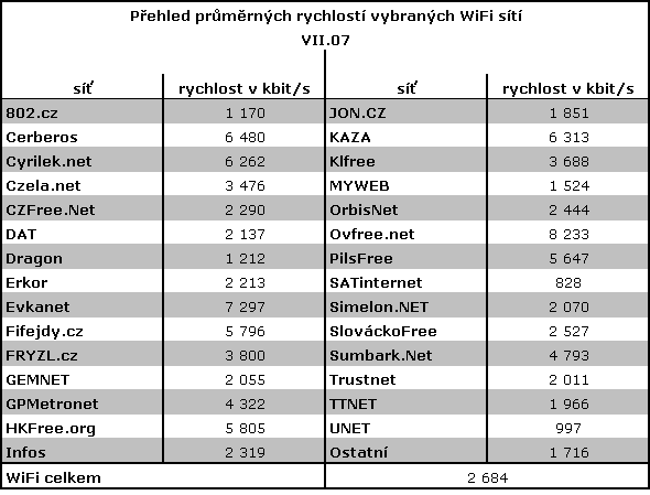 Poslední tabulka s rychlostmi vybraných bezdrátových sítí znovu potvrzuje trend stálého zvyšování rychlostí u většiny poskytovatelů.