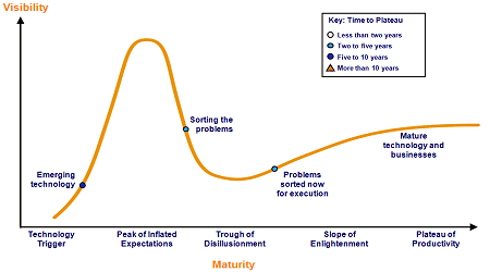 Sledované technologie (ale i metody, postupy atd.) přitom v různých fázích svého vývoje vykazují určitou míru „viditelnosti“, a to nejen ve smyslu viditelnosti v médiích, ale především ve smyslu vkládaných očekávání a nadějí. Důležité přitom je, že tato závislost „viditelnosti“ na „stavu zralosti“ je prakticky nezávislá na tom, o jakou konkrétní technologii jde, resp. je u všech technologií stejná – a tak může být zobecněna, neboli vyjádřena jako obecná závislost. Dokonce ji lze nakreslit jako konkrétní křivku v rámci grafu, kde na ose X je stupeň zralosti technologie, a na ose Y viditelnost, viz následující obrázek.
