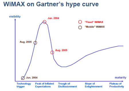 Samotná „křivka humbuku“, jako obecná závislost mezi vyzrálostí a viditelností, může být využita více různými způsoby. Jedním z nich je časové „zasazení“ určité konkrétní technologie do této křivky tak, aby bylo vidět, kdy a kde se nacházela v určitých časových okamžicích. Příklad, pro technologii WiMAX, vidíte na následujícím obrázku (byť už poněkud staršího data).
