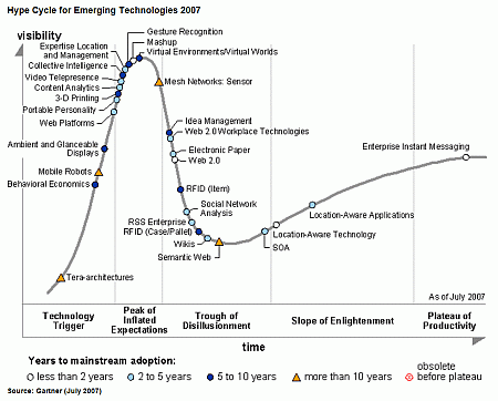 Obrázek 3: Příklad zobrazení stavu vývoje různých technologií k jednomu konkrétnímu datu (zde: nastupující technologie, k červenci 2007): Zdroj: TZ Gartner Inc.