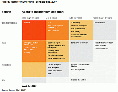 A aby tuto míru dopadu skombinovala s rychlostí vývoje, resp. dobou do dosažení zralosti příslušné technologie a jejího rutinního využití (mainstream adoption), navrhla ještě doplňující tabulku, resp. matici, označovanou jako „matici priorit“. Příklad takovéto tabulky (opět pro „nastupující technologie“ a k červenci 2007) vidíte na následujícím obrázku.