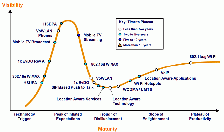 Obrázek 5: Křivka humbuku pro přenosové a související technologie, 2004-5 (zdroj)
