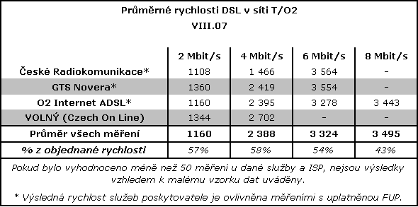V porovnání s „objednanou“ rychlostí dosahují relativně nejhorších výsledků přípojky s nominální hodnotou 8 Mbit/s. Jejich maximální rychlosti ve skutečnosti nedosahují ani 7 Mbit/s.