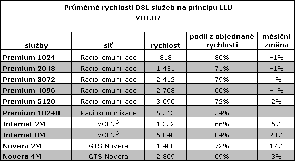 V tabulce rychlostí DSL na principu LLU je uvedena i nejrychlejší DSL služba Premium 10240. Tuto službu má však objednanou minimum zákazníků, a proto není na měřáku DSL.cz k dispozici dostatečný počet měření pro přesnější vyhodnocení skutečně dosahovaných rychlostí.