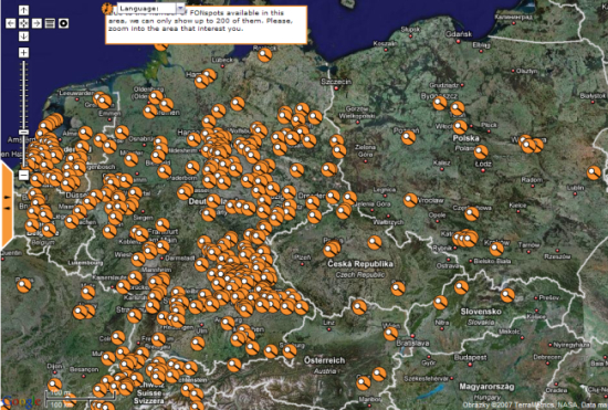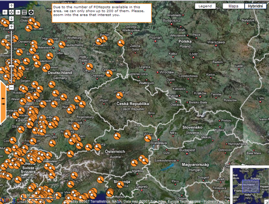 Zatímco naší západní sousedé se v pokrytí hotspoty FONu doslova utápějí (a to jich je zobrazena jen malá část), u nás to vypadá na bezdrátovou tmu. K tomu se ještě dostaneme. Nicméně na dalších dvou obrázcích to tak zle, ne však dobře, nevypadá. Jestliže chcete zjistit, kolik FPN hotspotů se ve vašem okolí nachází, nebo v okolí cílů vašich častých cest, podívejte se přímo na mapu pokrytí.