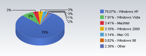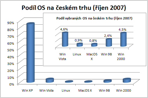 Hlavní zásluhu na tom stále mají Windows XP, které se vysokému zájmu uživatelů těší mnoho let. U nás je používá více než 85 % uživatelů s přístupem na internet, ve světě už ale klesly pod 80 %. Propad na obou frontách je způsoben zejména migrací uživatelů na nejnovější systém Microsoftu Windows Vista, jejichž podíl stoupá takřka konstatní měrou. Co se Vist týče, Česko stále zaostává; ve světě jsou skoro dvakrát tak populární než u nás. Podrobnosti v grafech níže.