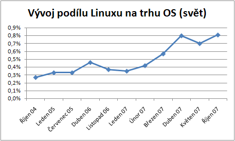 Když se podíváte na starší, přitom ne zas tak staré, statistiky zastoupení operačních systémů s jádrem Linuxu, všimnete si, že za polední dva roky silně posilují. Slovíčko „silně“ si nesmíte však vykládat tak, že z nuly by se Linux dostal na mnoho procent. Ovšem když si nakreslíme graf ukazující podíl těchto operačních systémů za poslední dva roky, vidíme, že se opravdu zvedá. Největší skok nastal mezi druhou polovinou roku 2005 a první půlkou roku 2006 (z cca 0,3 % na 0,5 %, což ― při tak malých číslech ― činí absolutní skok o 67 %), ale křivka se začala „nebezpečně“ zvedat hlavně během letošního roku.