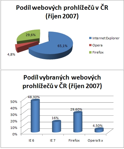 Lídrem mezi webovými prohlížeči stále zůstává Internet Explorer od společnosti Microsoft, byť jeho náskok není v poslední době tak velký jako před pár lety. U nás mu v současné době patří asi 65 % trhu, ve světě dokonce takřka 78 %. Dvojkou je tradičně Firefox, kterému v Česku patři skoro třetina trhu (29,6 %), ve světě pak zhruba 15 %. Opera zatím díru do světa neudělala, u nás je 5krát oblíbenější (zhruba 5 % vs 1 %).