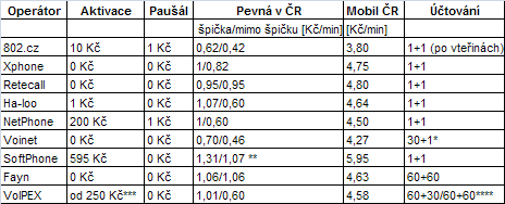 Počet VoIP operátorů v Česku je poměrně vysoký, takže se zaměřme na ty největší a nejznámější z nich, u kterých jsou nízké zřizovací náklady. V tabulce si je srovnáme dle cen za volání s přihlédnutím ke způsobu tarifikace.