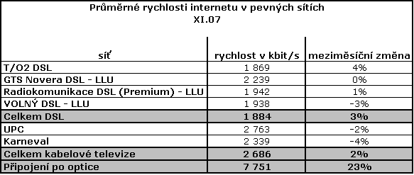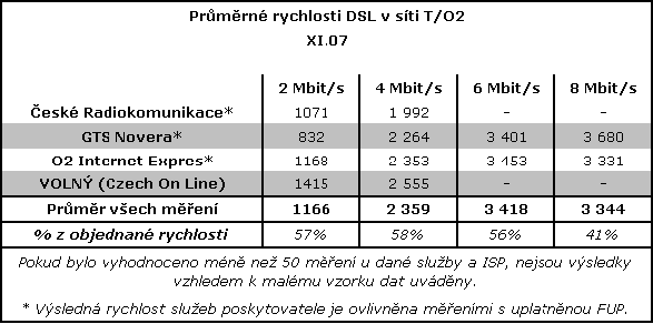 Jak bylo vidět v předcházející tabulce, k výrazným změnám dosahovaných rychlostí DSL v síti Telefóniky O2 (dále T/O2) nedochází.