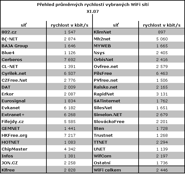 V posledním přehledu jsou průměrné rychlosti bezdrátových sítí, od kterých je na měřáku DSL.cz k dispozici největší počet měření.