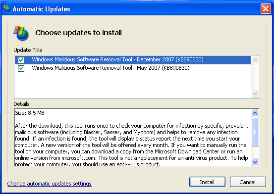 Po prvním spuštění vás XP SP3 vyzvou k nainstalování aktualizací. Zde jen Nástroj pro odstranění škodlivého softwaru. Jaká to úleva.