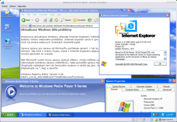 Windows XP SP3 ve VirtualBoxu pod XP SP2. Větší obrázek zde.