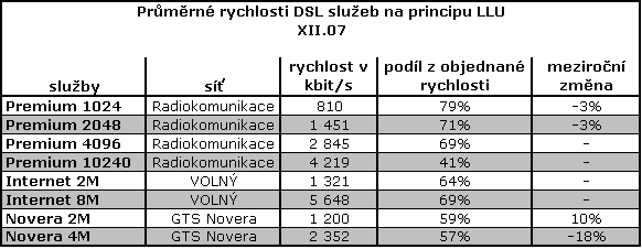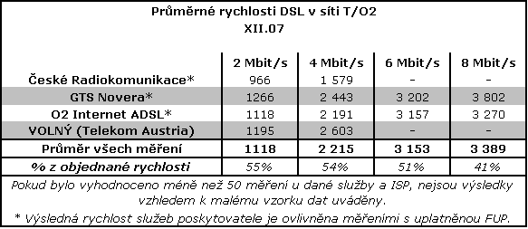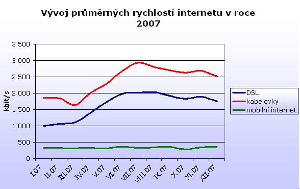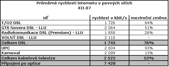 Nejvýraznější zvýšení rychlostí v roce 2007 zaznamenali zákazníci DSL služeb v síti Telefóniky O2 (T/O2). Slušné nárůsty zaznamenali i zákazníci DSL služeb na principu pronájmu místní smyčky (LLU). Nejrychlejší internetové přípojky mají z velký poskytovatelů zákazníci kabelového operátora UPC.