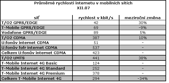 Zatímco v roce 2006 dosahovaly průměrné rychlosti mobilního internetu v ČR 318 kbit/s, průměr za loňský rok se zvýšil pouze na 332 kbit/s. Rychlosti mobilního internetu tak v porovnání s jinými možnostmi internetového připojení stále více zaostávají. Letité prognózy a přání o mobilním internetu s rychlostmi v řádu několika Mbit/s se tak stále nenaplňují.