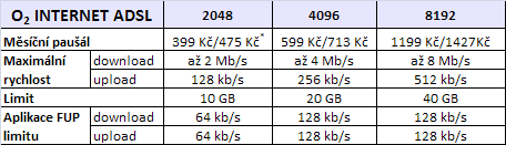 Na první pohled vidíme již tradiční tři rychlostní varianty pro download (směrem k zákazníkovi) od 2 do 8 Mbit/s. Rychlosti směrem od uživatele (upload) se bohužel od dalších konkurenčních nabídek neliší. Dnes již směšná rychlost 128 kbit/s neudělá radost asi nikomu, kdo chce někdy poslat svým známým alespoň pár rodinných fotek. ADSL se nejmenuje sice ADSL pro nic za nic, ale asymetrie mezi rychlostmi by vůbec nemusely být tak markantní. I nejrychlejší varianta Internet ADSL 8 Mbit/s je doprovázena stále ― pro dnešní účely ― nepostačující rychlostí uploadu s hodnotou 512 kbit/s.