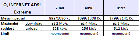 Tabulka 3-4: Nabídka O2 Internet ADSL i s typem Extreme (analogickým typu Business u T-Mobile). (*Cena bez DPH/s DPH, zaokrouhleno, nezapočítány poplatky za pevnou linku ani hlasové paušály.)