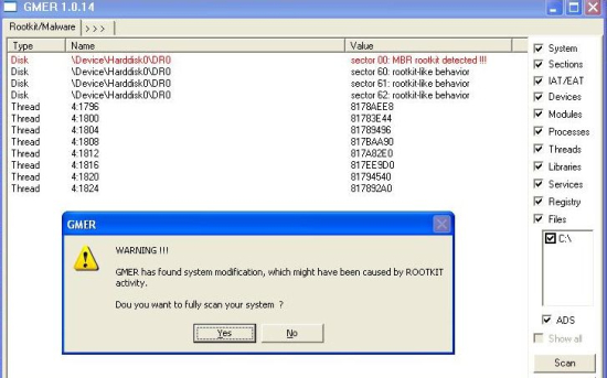 Aplikace GMER rootkit našla. Větší obrázek zde.