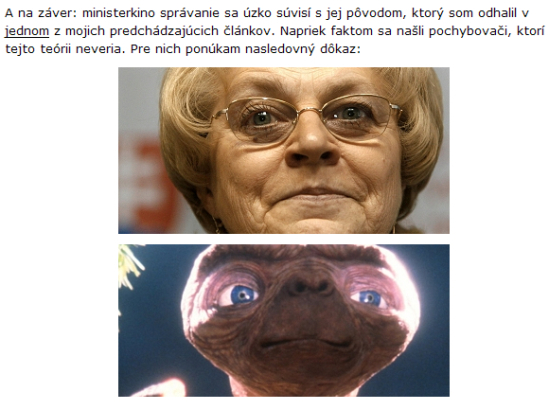 Slovenská ministryně práce Viera Tomanová žaluje šéfredaktora slovenského týdeníku Trend. Rado Baťo totiž na svém osobním blogu přišel s odhalením, že Tomanová není z planety Země, ale z jiného místa v Galaxii. Své tvrzení doložil srovnáním fotografie ministryně se snímkem, na kterém je vyobrazen E.T. mimozemšťan ze slavného Spielbergova filmu.