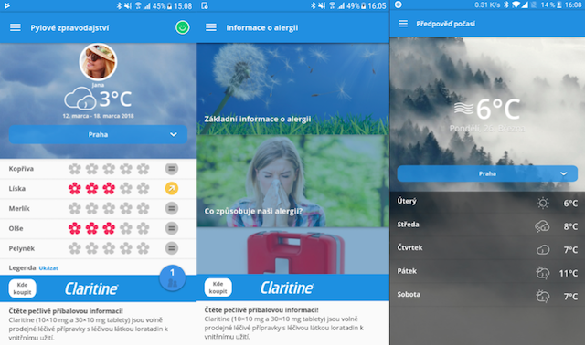 Potom přejdete k pylovému zpravodajství. Nejvíc vás bude zajímat dolní polovina, ve které je 5 květinek. Vybarvené značí koncentraci pylů rostlin ve vašem bezprostředním okolí. Aplikace skutečně zohledňuje místo, na němž se nacházíte. Uvidíte navíc, jestli pylové šílenství spíš klesá nebo nabírá na obrátkách. Sledujte přes appku i meteorologickou situaci a údaje o teplotě.