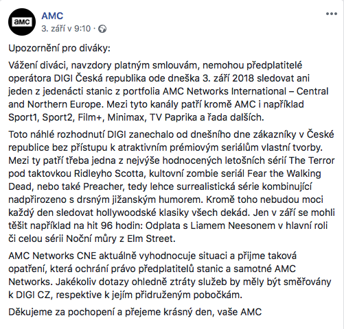 Dne 3. září uvěřejnila Digi TV tiskovou zprávu, v níž diváky informuje o tom, že ukončila spolupráci s americkou společností AMC Networks a diváci tak přijdou o kanály, které pod ni spadaly. AMC ale na svém Facebooku informovalo, že smlouval mezi ní a Digi TV je stále platná.