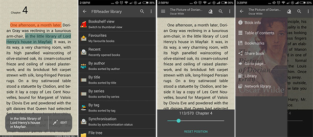 Velmi kladně čtenáři hodnotí aplikaci FBReader. Její základní verzi si můžete stáhnout zdarma, s dalšími rozšířenými funkcemi je pak ke stažení za příplatek. I v základní verzi se vyznačuje velkými možnostmi nastavení. Je k dispozici jak pro EPUB, Kindle, fb2, rtf, html, formáty, ale i pro prostý text. Po spuštění aplikace naleznete v knihovně seznam knih, které máte k dispozici zdarma, do aplikace si můžete uložit své oblíbené knihy a máte také přístup do dalších katalogů. Aplikace umožňuje překlad textů pomocí překladače Google a k dispozici je samozřejmě možnost čtení knih off-line.