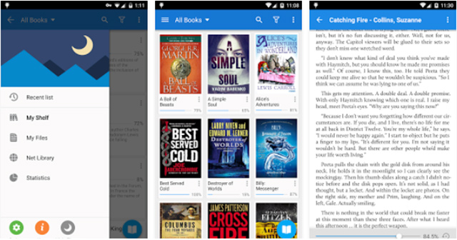 Další vysoce hodnocenou aplikací je Moon+ Reader. Také tato aplikace je ke stažení v základní verzi zdarma a za přípatek v rozšířené verzi s dalšími funkcemi. Nabízí rovněž stovky knih zdarma, podporu různých formátů pro čtení a denní a noční režim, ve kterém se mění podsvícení obrazovky. Čtecí pozici pak lze přes Dropbox synchronizovat s dalšími zařízeními.