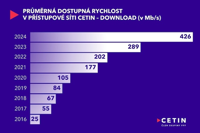 Podle nejnovějších údajů CETIN se průměrná rychlost dostupného připojení meziročně výrazně zvýšila a na konci roku 2024 dosáhla 426 Mb/s. Počet přípojek v jeho síti pak dosáhl 4,49 milionu.