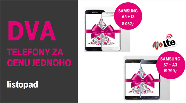 Noví i stávající zákazníci si budou, v rámci vánoční nabídky od T-Mobile, moci pořídit dvě vybrané zařízení za cenu jednoho. Během listopadu je možné pořídit Samsung Galaxy A5 a Samsung Galaxy J3 za 8 052 Kč nebo Samsung Galaxy S7 32 GB a Samsung Galaxy A3 za 19 799 Kč, během prosince je pak vystřídají jiné dvě dvojice, které operátor zveřejní později.
