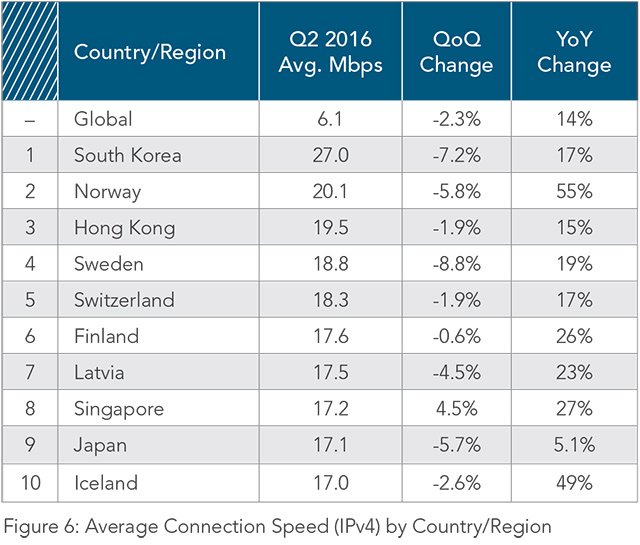 Nejrychlejší internet na světě mají v Jižní Koreji, kde rychlost dosahuje průměrně 27 Mb/s. Jižní Korea má výrazný náskok nad druhým Norskem, kde je průměrná rychlost 20,3 Mb/s a celým světem. Třetí místo patří Hongkongu, kde agentura naměřila 19,5 Mb/s. Oproti prvnímu čtvrtletí letošního roku průměrná rychlost internetu ve většině zemí klesla.