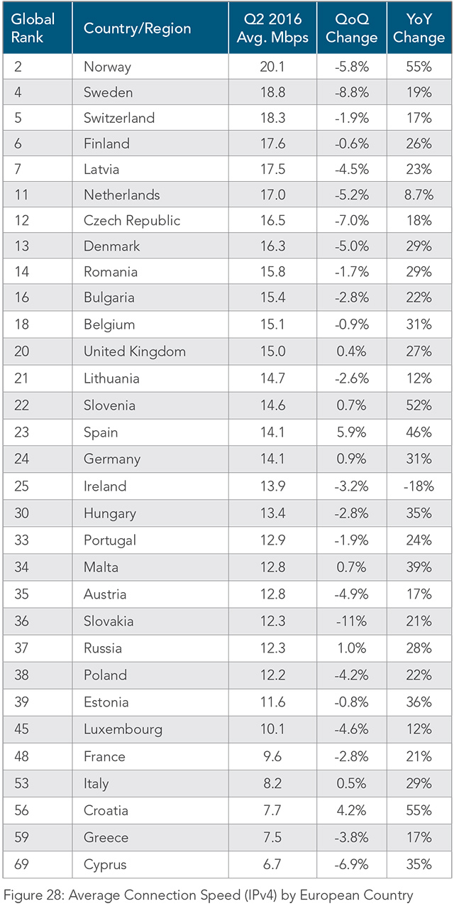 V rámci Evropy se Česká republika s průměrnou rychlostí umístila na sedmém místě. Před námi je kromě Norska i Švédsko, Švýcarsko, Finsko, Lotyšsko a Nizozemí. V Norsku se průměrná rychlost oproti stejnému období loňského roku zvýšila o 55 %. Sousední Slovensko skončilo s průměrem 12,3 Mb/s v rámci Evropy na 22. pozici a celosvětově obsadilo 36. místo.