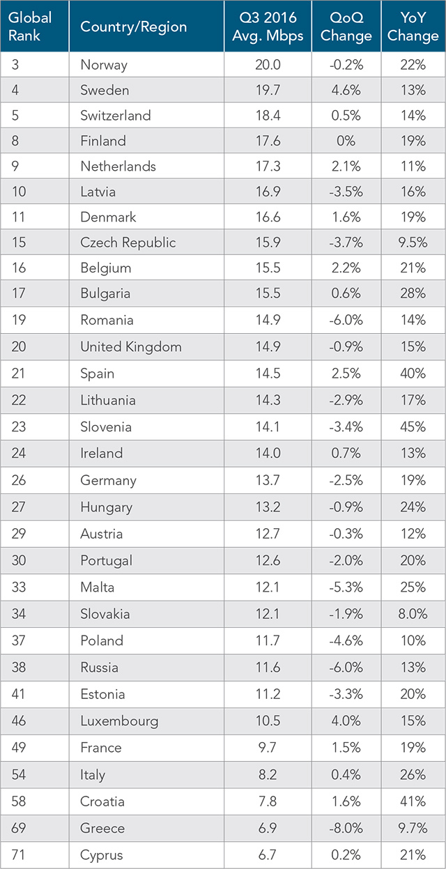 V rámci Evropy se Česká republika s průměrnou rychlostí umístila na osmém místě. Před námi je kromě Norska i Švédsko, Švýcarsko, Finsko, Nizozemí, Lotyšsko a Dánsko. V Norsku se průměrná rychlost oproti stejnému období loňského roku zvýšila o 22 %. Sousední Slovensko skončilo s průměrem 12,1 Mb/s v rámci Evropy na 22. pozici a celosvětově obsadilo 34. místo.