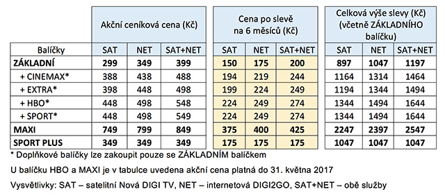 Například balíček MAXI internetové televize DIGI2GO, který obsahuje 88 kanálů, z toho 40 v HD kvalitě, včetně programů HBO, Cinemax a DIGI Sport 1 HD, 2 HD a 3 HD tak stojí na půl roku jen 400 Kč měsíčně. Za půl roku s ním zákazníci ušetří skoro 2 400 korun.