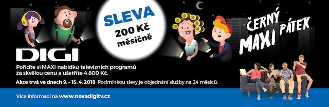 Od dnešního rána do večera 15.4. máte jedinečnou možnost pořídit si Digi TV za skvělou cenu! Pokud si v tomto časovém rozpětí objednáte balíček MAXI, budete místo 799 Kč měsíčně platit jenom 599 Kč měsíčně.