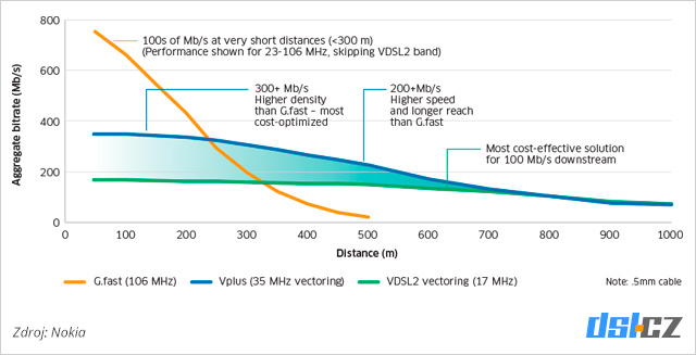 Zástupci společnosti uvedli, že pro dosažení maximální dostupné rychlosti je potřeba, aby přípojka byla od ústředny vzdálena maximálně 350 metrů. Přibližně na 500 metrech se rychlost snižuje na úroveň technologie VDSL2, tedy na maximálně 100 Mb/s.