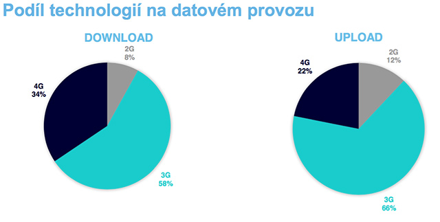 Nejvyšší podíl na přenosu dat v mobilní síti má stále 3G, rychle ji ale dohání 4G. Vliv na to má kromě stále vyšší dostupnosti internetu také větší počet chytrých telefonů v síti, které tvoří 44 % mezi všemi telefony v síti. LTE podporuje zatím jen 12 % z nich.