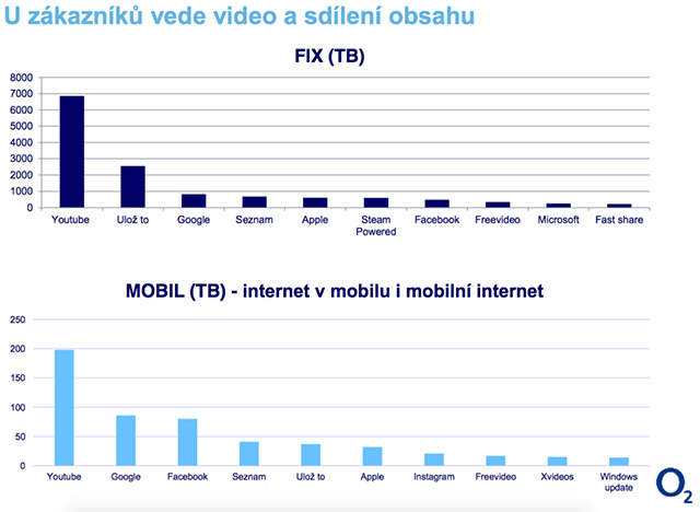 Velký objem dat přenášených v síti O2 zaujímá video, kterému jasně dominuje Youtube. Velmi populární jsou také služby sdílení obsahu a distribuce softwaru pro mobily a počítače. Do první desítky se zařadil i Facebook a všechen obsah, který je na něm zveřejňovaný – tedy nejen statusy, ale také fotky a videa sdílená přes sociální síť.