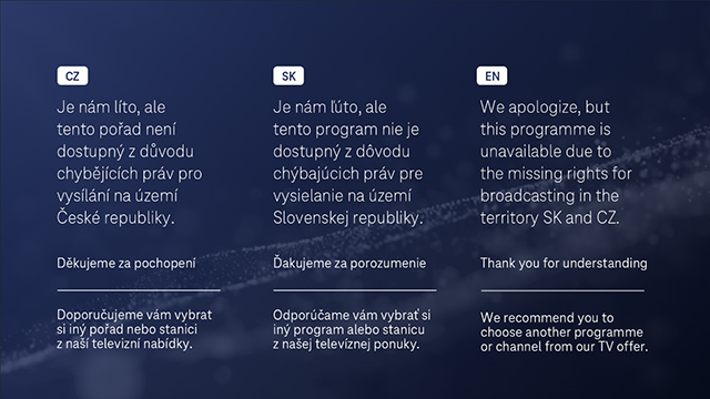 "Na základě výzvy exkluzivního vlastníka práv na vysílání Formule 1 v ČR – TV Nova – jsme povinni blackoutovat vysílání německé stanice ORF 1, která vysílá reprízy přenosů Formule 1, ale nemá práva pro vysílání těchto pořadů na území České republiky. Tento víkend se jedná o pořady v sobotu od 20:15 a v neděli od 0:05 hod. Z technických důvodů může být kanál ORF1 nedostupný i v jiných časech. V čase blackoutu – tj. řízeného dočasného vypnutí vysílání – bude místo programu ORF 1 zobrazována níže uvedená obrazovka:"