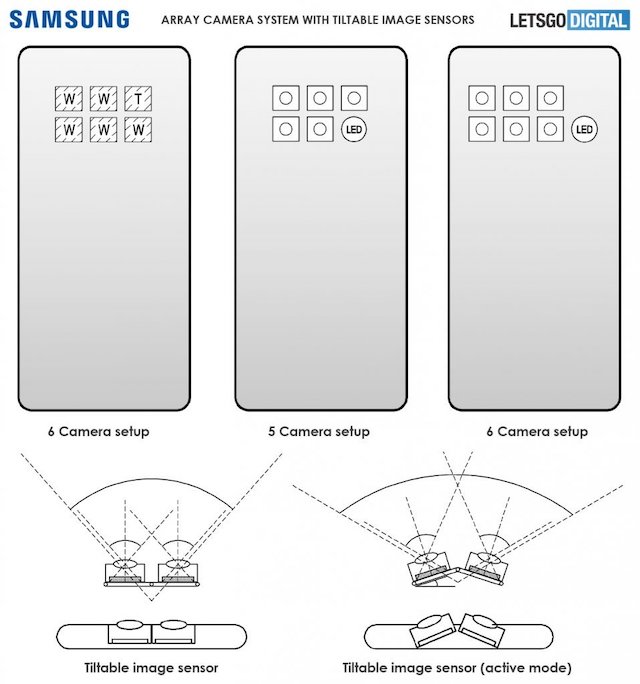 Jihokorejský Samsung si loni v prosinci nechal patentovat smartphone s šesti čočkami a výklopnými kamerkami. Objektivy jsou podle přihlášky seskupeny do matice 3x2.