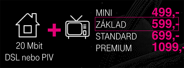 I tyto dvě služby T-Mobile zvýhodní. Pořiďte si do 31. prosince tarif T-Mobile TV Mini zároveň s některým z tarifů Pevného internetu a získejte tak měsíční slevu 49 Kč. Za obě služby tak zaplatíte od 499 Kč za měsíc (s tarifem Pevný internet 20). Pro tarify T-Mobile Základ, Start a Premium v kombinaci s Pevným internetem platí celková sleva 199 Kč. To znamená, že budou stát 599 Kč, 699 Kč, resp. 1 099 Kč (opět s tarifem Pevný internet 20).